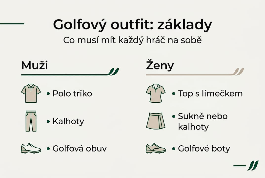 Až se budete chystat na hřiště, první otázka zní: co je povinné a co je zakázané? Základní pravidla dress codu jsou v ČR jasná: žádné džíny, žádná tílka s tenkými ramínky, žádné příliš krátké sukně nebo šortky. Povinné je polo tričko s límečkem a golfové kalhoty nebo šortky ne kratší než do půlky stehen. Tato pravidla platí pro muže i ženy, i když s určitými odlišnostmi.