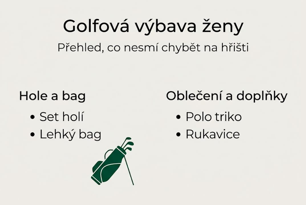 - Základní výbava zahrnuje hole, bag, míčky, oblečení a doplňky pro komfort a etiketu.