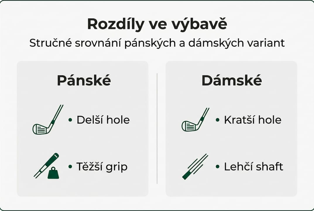 Nejvýraznější rozdíl je u holí. Dámské hole jsou obvykle o 2,5 až 5 cm kratší než pánské, mají lehčí shaft a měkčí flex. Flex je ohebnost shaftu a přímo ovlivňuje, jak se energie přenáší z vašeho švihu do míče. Ženy mají průměrně nižší rychlost švihu, proto potřebují měkčí flex, který jim pomůže dostat míč do vzduchu bez zbytečné námahy. Muži s vyšší rychlostí švihu naopak potřebují tužší shaft pro přesnou kontrolu.